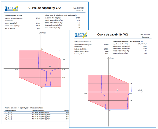 A versão avançada, Ampère Evolution, expande ainda mais as capacidades de análise ao calcular a curva de capacidade V/Q. Essa funcionalidade é essencial para avaliar o impacto da geração na tensão da rede, indicando a variação da tensão no ponto de entrega em relação à potência reativa injetada. Isso é especialmente crucial em cenários de máxima potência ativa. O software também identifica automaticamente as interseções com os limites de Q/Pmax definidos por normativas (por exemplo, +30% e -35% para sistemas fotovoltaicos, e +20% para eólicos).