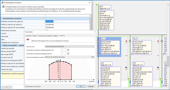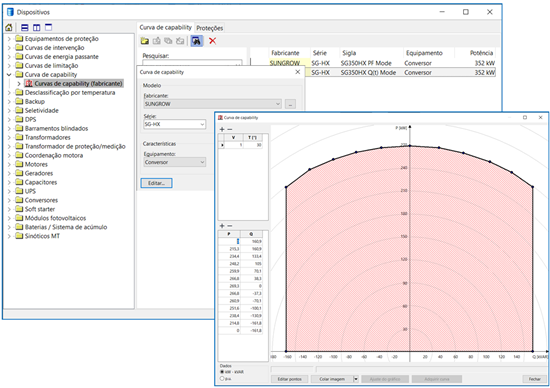 Com a Ampère 2025, você pode importar curvas P/Q diretamente dos fabricantes. Isso significa que o software considera as variações da potência reativa (Q) em função da potência ativa (P), levando em conta fatores cruciais como a tensão da rede e a temperatura ambiente. Cada curva é definida por dados específicos e pontos precisos, e os valores de potência podem ser expressos em termos absolutos ou relativos (p.u.), oferecendo flexibilidade e precisão na análise.