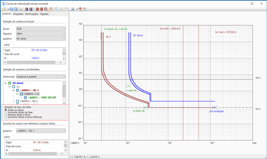 Além disso, as curvas de intervenção ganharam melhorias gráficas que facilitam a leitura e a comparação entre dispositivos. Uma nova ferramenta foi adicionada na janela de Seletividade, que permite avaliar a curva de intervenção de uma proteção em relação às correntes de curto-circuito — seja para todas as faltas, apenas faltas de fase ou apenas faltas à terra.