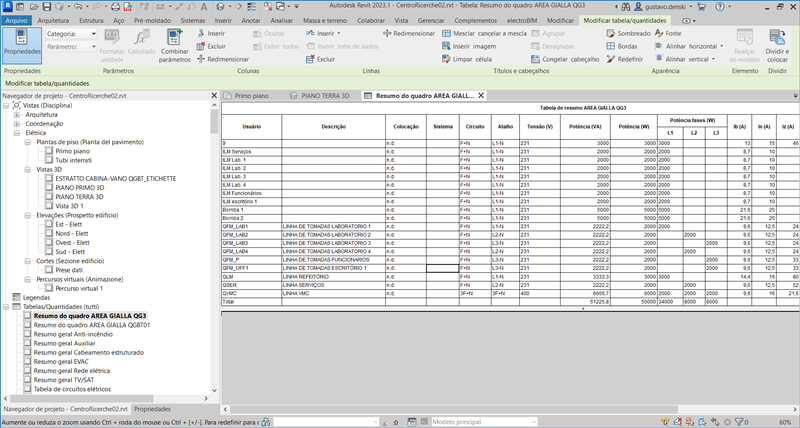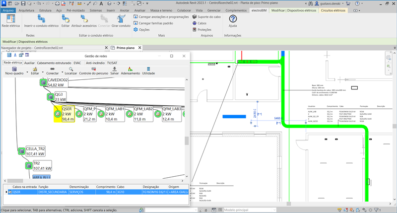 A função de encaminhamento automático de cabos conecta os vários elementos do sistema aos quadros de distribuição e determina os caminhos ideais ao longo das principais vias modeladas. A propagação de potência pelos vários níveis do sistema determina a seção transversal dos condutores com base no tipo de cabo e nas instalações associadas aos caminhos percorridos, realiza o dimensionamento das proteções previstas e calcula a queda de tensão em cada ponto do sistema. Por fim, o preenchimento dos caminhos dos cabos, seja por eletrodutos, canaletas ou eletrocalhas, é gerenciado; elementos de anotação estão disponíveis para visualizar todas as informações sobre o estado dos condutos elétricos.