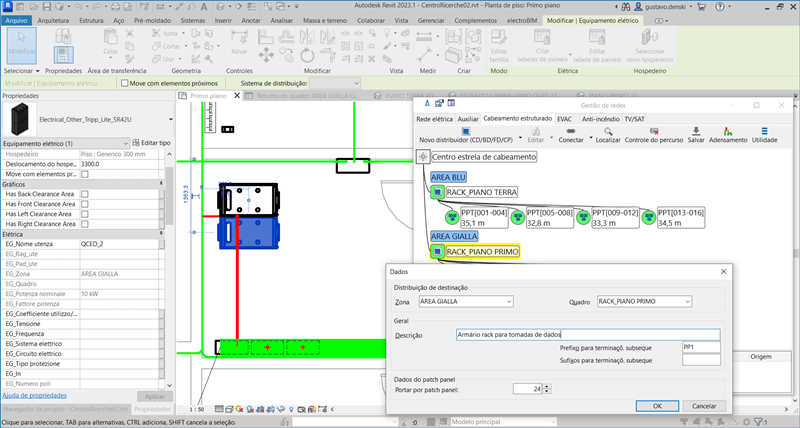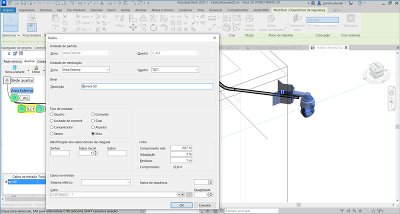 A função de encaminhamento automático de cabos conecta os vários elementos do sistema aos quadros de distribuição e determina os caminhos ideais ao longo das principais vias modeladas. A propagação de potência pelos vários níveis do sistema determina a seção transversal dos condutores com base no tipo de cabo e nas instalações associadas aos caminhos percorridos, realiza o dimensionamento das proteções previstas e calcula a queda de tensão em cada ponto do sistema. Por fim, o preenchimento dos caminhos dos cabos, seja por eletrodutos, canaletas ou eletrocalhas, é gerenciado; elementos de anotação estão disponíveis para visualizar todas as informações sobre o estado dos condutos elétricos.